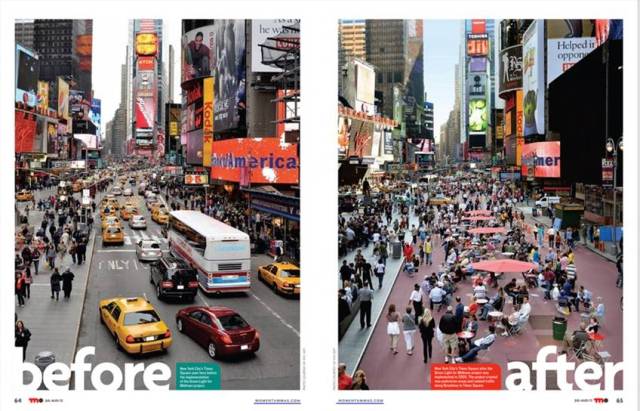A l’extrem oposat de Niça hi podem trobar la ciutat de Nova York. Poques ciutats al món encarnen tant bé la imatge de ciutat dominada pel vehicle privat i el trànsit. Potser per trencar amb aquesta imatge i per a recuperar una mica d’espai per al vianant per a usos més socials i amables, la ciutat va impulsar un seguit d’actuacions que s’han convertit en la icona de la ciutat pel que fa a la mobilitat.