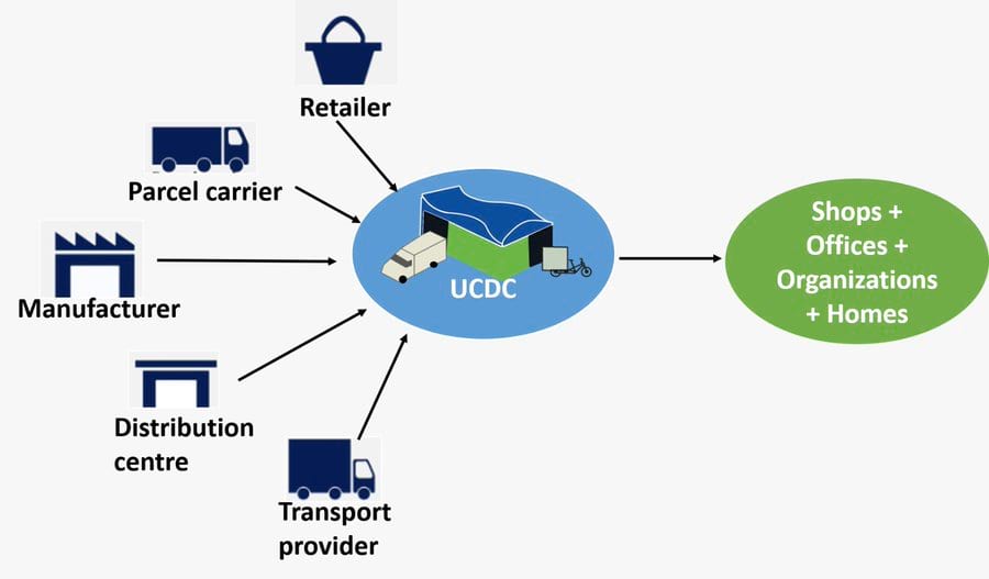 Des de l’Àrea Metropolitana de Barcelona (AMB) s’ha fet una aposta per aquest sistema de distribució urbana de mercaderies que es basa en dos conceptes clau. Per una banda un hub de concentració de mercaderies i, per altra banda, un sistema lleuger, sostenible i àgil de distribució de paqueteria, com per exemple la ciclologística.