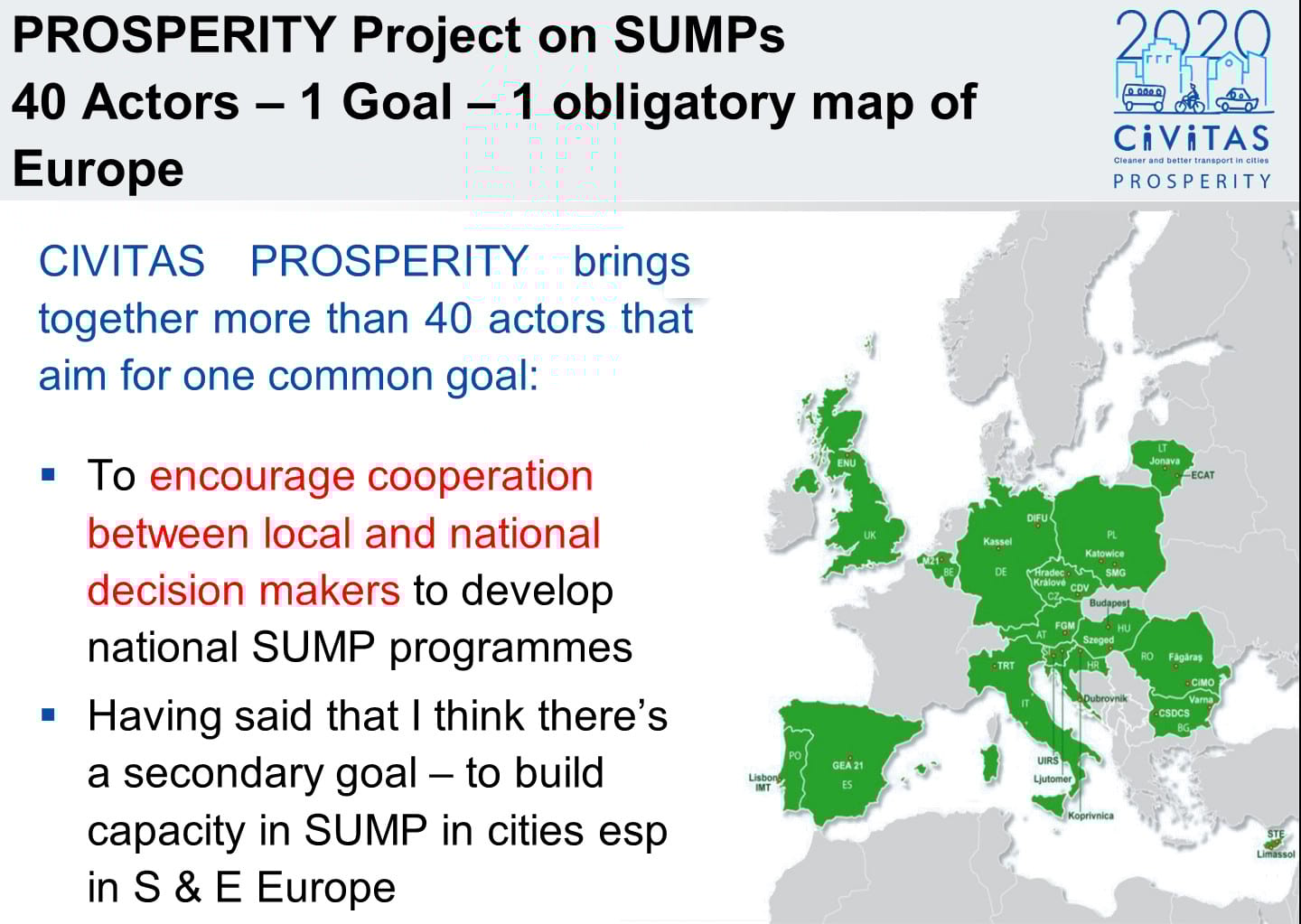 En aquest sentit el ponent va posar d’exemple el projecte PROSPERITY, al qual participen més de 40 actors de 16 estats diferents, i que és un bon exemple de cooperació. L’objectiu del projecte és fomentar la cooperació entre les autoritats locals i nacionals per tal de crear un marc comú per al desenvolupament de plans de mobilitat urbana sostenible.