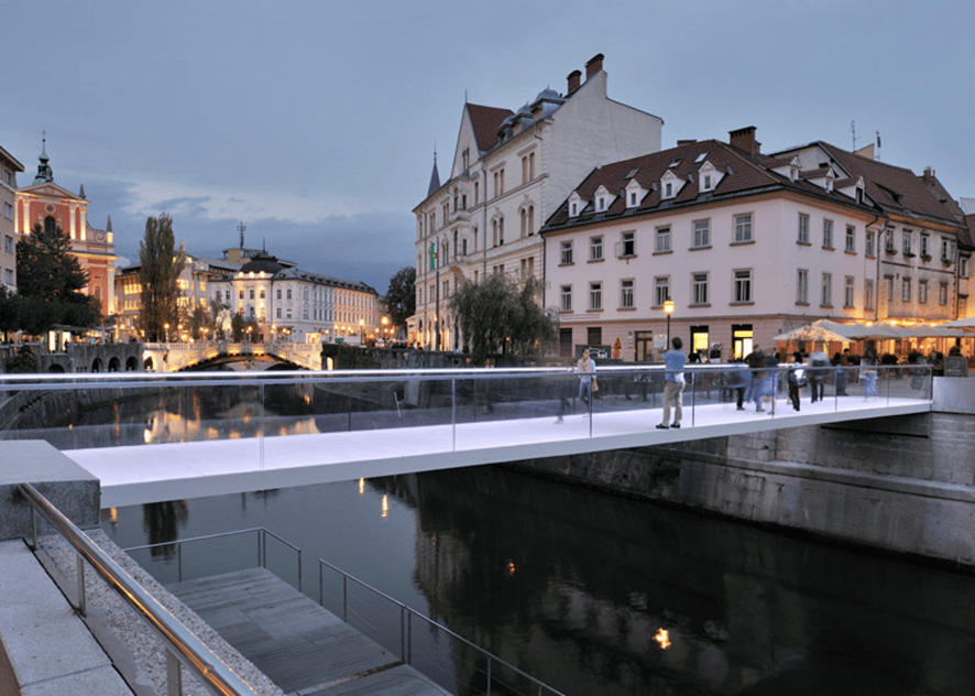 La transformació dels principals carrers es va completar amb la transformació, també, de les ribes del riu Ljubljianica, amb la creació de zones verdes i itineraris per a mobilitat activa, així com la creació de diverses passarel·les per a vianants.
