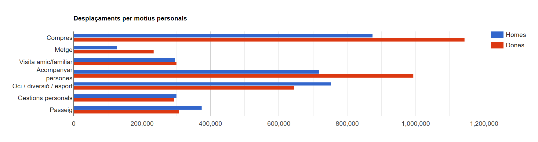 Si mirem el motiu dels desplaçaments entre homes i dones si que s'observa clarament el biaix de gènere en la mobilitat: les dones realitzen més desplaçaments vinculats a tasques de la llar (compres) i a acompanyar persones (fills i gent gran), mentre que els homes fan més desplaçaments en tot allò que té a veure amb les gestions personals i l'oci.