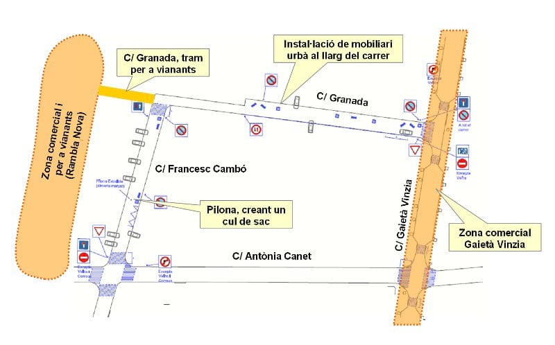 Per tal de convertir aquests carrers en zona de vianants es va prohibir l’estacionament dels vehicles i es va limitar l’accés en vehicle només als veïns. L’actuació va consistir en col·locar diferents elements de mobiliari urbà (bancs, jardineres i papereres) al llarg dels dos carrers. Amb aquests elements es pretenia fer més amable el carrer, evitant l’estacionament i reduint la velocitat dels vehicles i també es va col·locar la senyalització pertinent tal i com es pot apreciar en el següent plànol:
