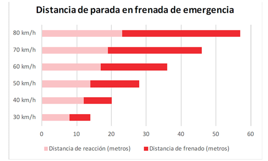 De fet, comparant la distància de detenció entre 30 km/h i 50 km/h estem parlant d’aproximadament el doble. En el primer dels casos es tracta d’una distància d’uns 13 metres i en el segon cas d’una distància de 28 metres.