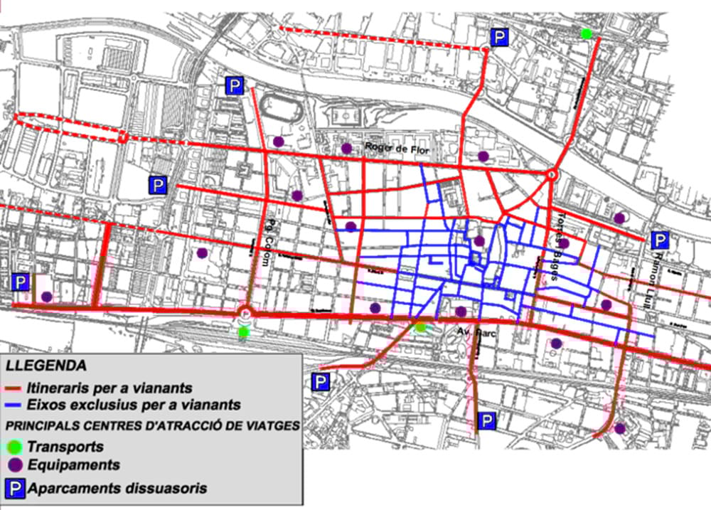 - Crear una xarxa d’aparcaments perifèrics al centre, tots ells gratuïts, i tots ells connectats al nucli històric mitjançant eixos de vianants (plànol 1). D’aquesta manera, les persones que volen accedir al centre ho poden fer deixant els vehicles en aquesta aparcaments i accedint a peu al centre urbà